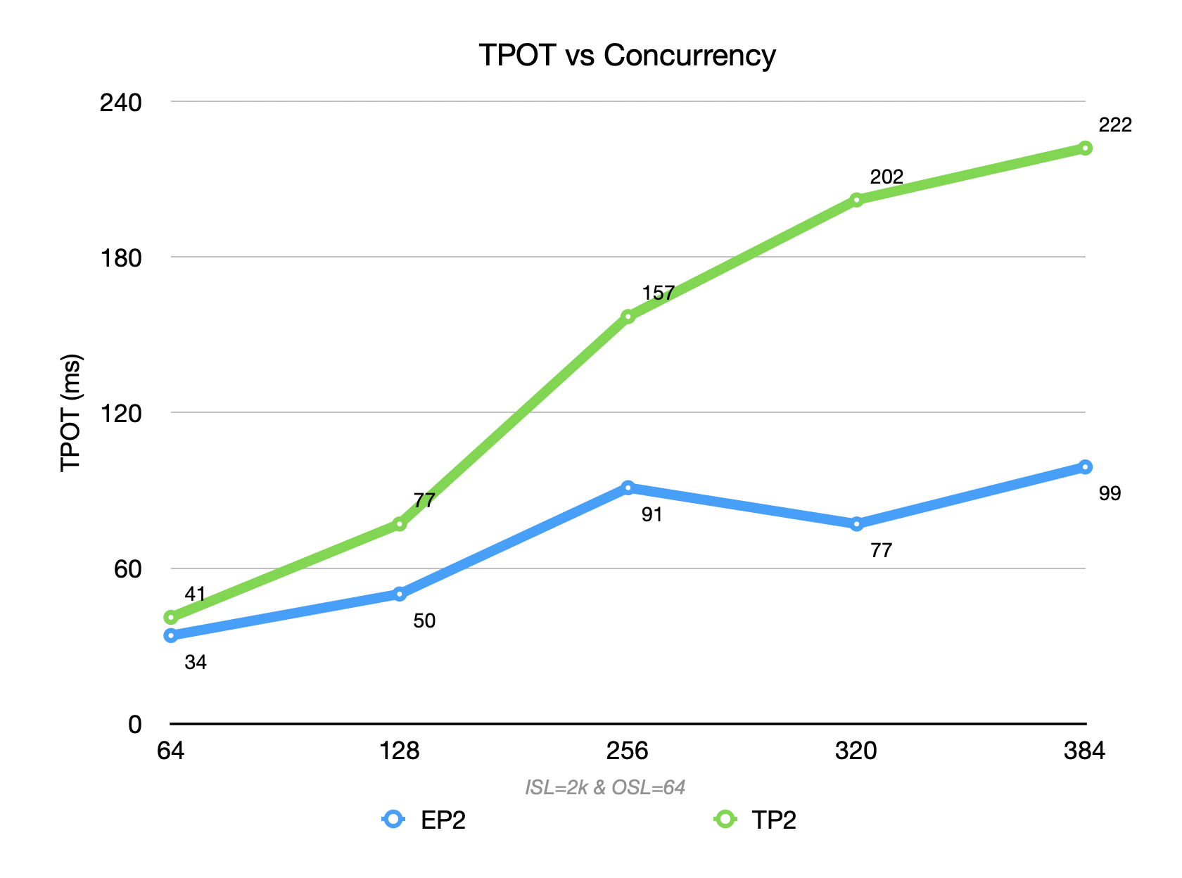 • In contrast, for output-heavy case, the TPOT advantage of EP=2 becomes dominant, and it is therefore the preferred configuration.
