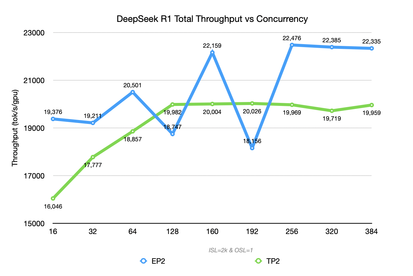 • DeepSeek R1 in EP2 can reach a peak Prefill throughput of ~ 22k TGS.