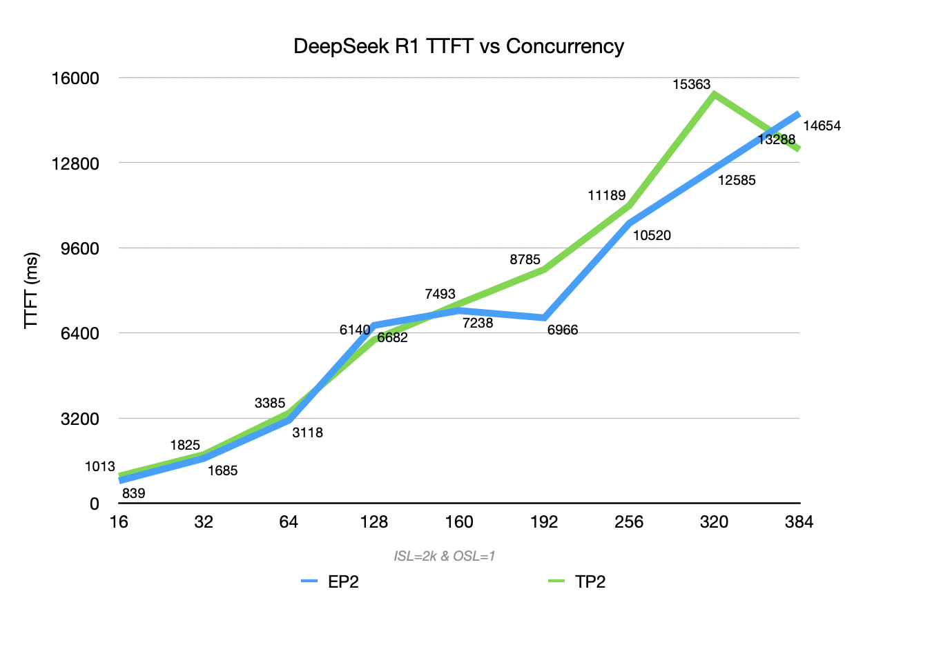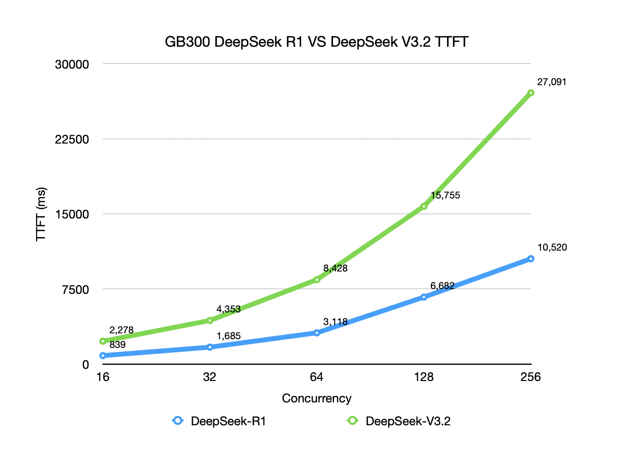 • Regarding TTFT, with both models using TP2, R1 reduces latency by about 55% compared to V3.2.