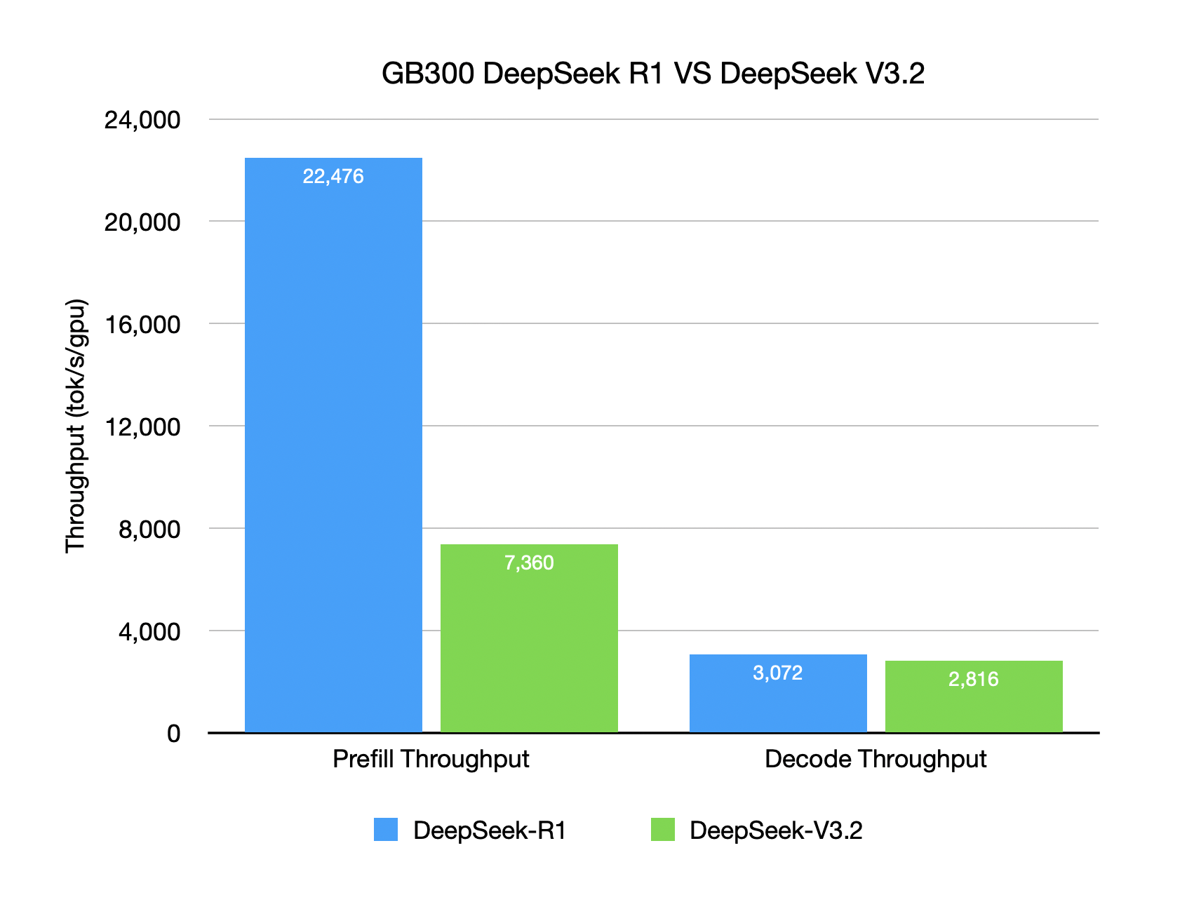 As shown in the chart below, with the same GB300 setup, DeepSeek R1’s Prefill throughput capability is ~ 3x that of DeepSeek V3.2.