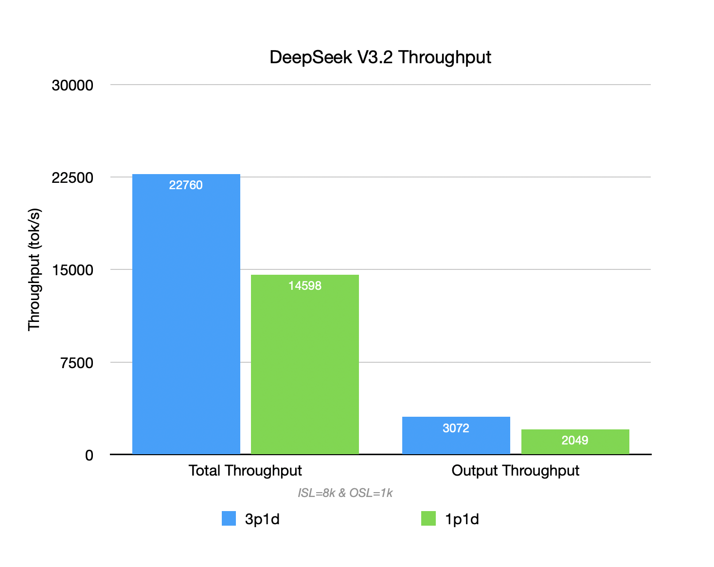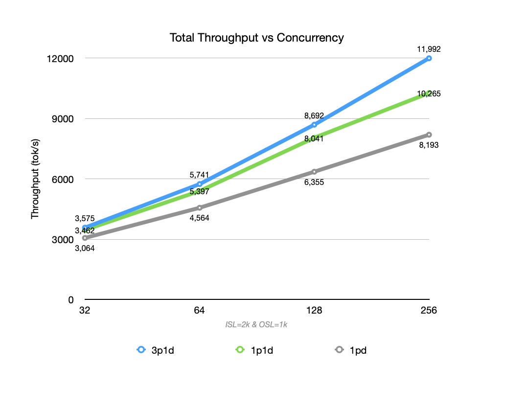 When ISL continues to grow (from 2K to 8K), the throughput of the 1P1D setup begins to struggle, with Prefill becoming the bottleneck. Requests wait in queue at the P node, failing to release the Decoder’s compute power. When adding 2 P replicas (3P1D), they parallelize the Prefill phase of more requests, achieving better total throughput.